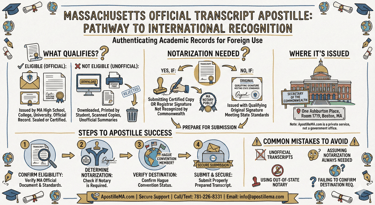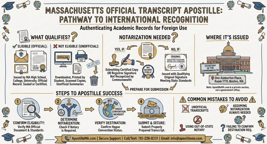 An official transcript apostille is required when a foreign government, university, or immigration authority must accept a Massachusetts-issued academic transcript. This process confirms that the document is authentic and recognized under international standards. For Massachusetts residents, attorneys, and immigration clients, understanding how an official transcript apostille works helps avoid rejection, delays, and unnecessary reprocessing.